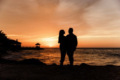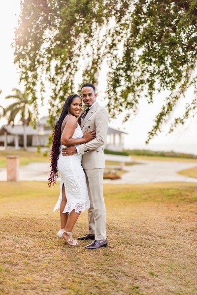The hour before sunset, what photographers call golden hour, is the best time for couples photography in Jamaica. The light is warm, directional, and deeply flattering. It wraps around subjects rather than flattening them and gives the images that warm, glowing quality that Jamaica is known for. I plan every session around this window.